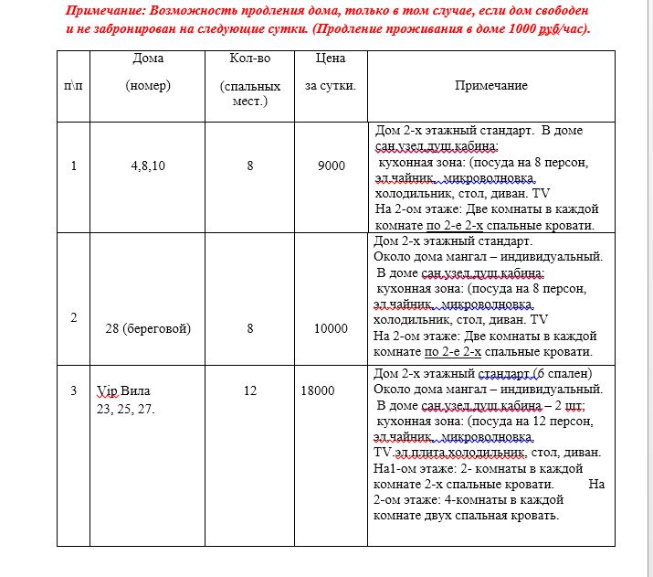 Далее - схема турбазы с номерами домиков и стоимость по номерам домиков.