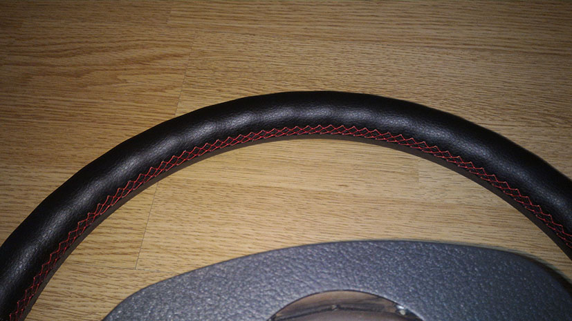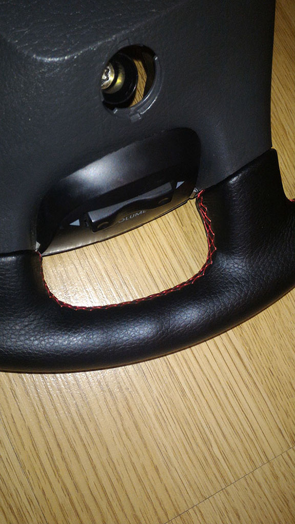 Ещё один.С Юрой списывался, ночь не спал, всё таки решил свой перетягивать, чёрный с нашим салоном не катит. Сейчас у меня покупная кожаная оплётка бежевого цвета, уже второй год, нормально смотрится.