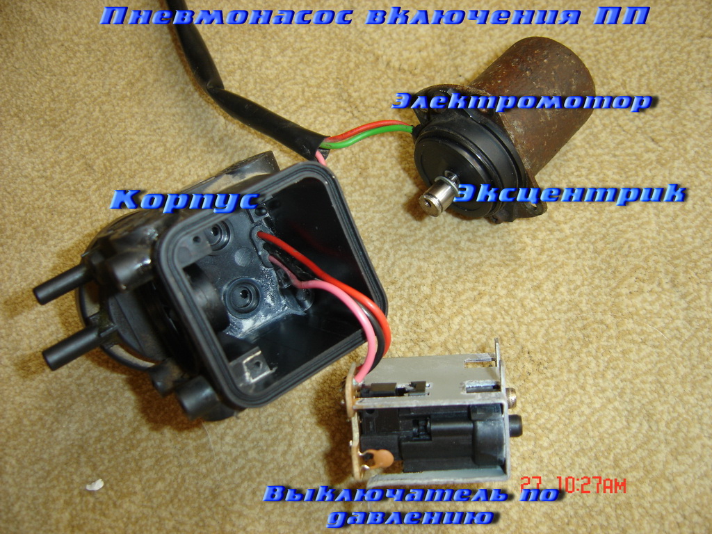 Прорвалась резинка муфты включения переднего привода в переднем мосту, масло попало через воздушную трубку в моторчик и залило его. Он работал, но нужно было его промыть. Разобрал, промыл, собрал. Не работает(гудит но не подключает). Разобрал, растянул немного пружинку плунжера, начал включаться мост, но пониженная не включается. Больше туда не лез. Возможно моторчик не докачивает нужное давление или перекачивает. Как проверить не знаю. Снял с другого соренто, все работает. Поэтому думаю поставить б\у и не заморачиваться. Если есть дельный совет, приму к сведению.