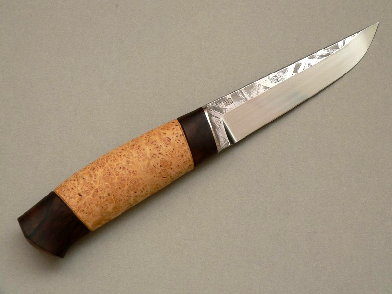 вообще он мне дофига чего делал, недешево, но зато полное взаимодействие с заказчиком - от идеи и материалов до ножен собственных (на финочки с готовыми Моровскими лезвиями он мне спецом делал ножны под ремень и отверстия под тренчик, хотя на "классике" финской совсем все по-другому)