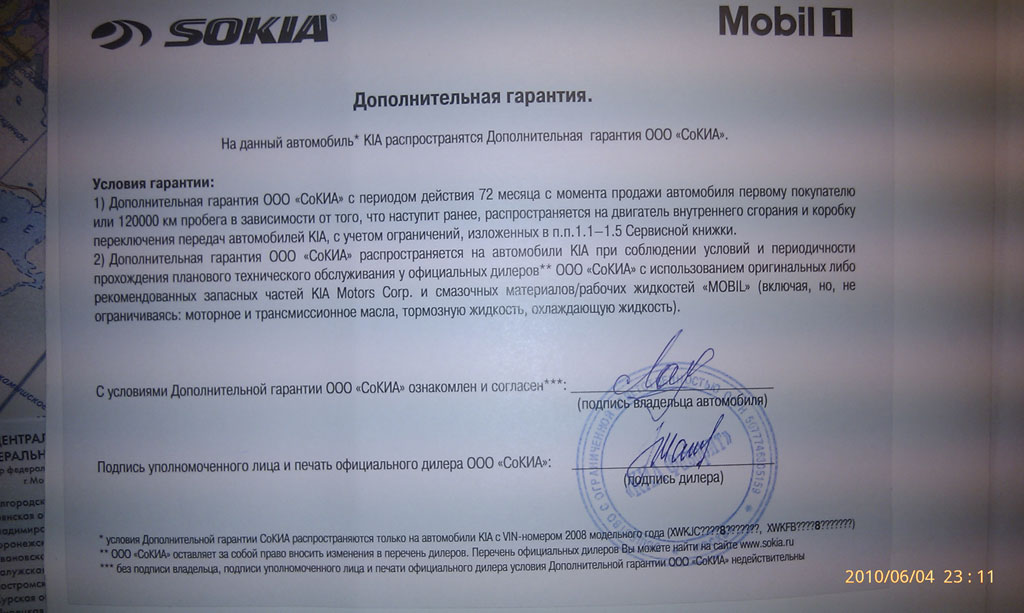 Скорее всего, это "дополнительная гарантия" не от СОКИА, а собственная гарантия от кого-то из дилеров. Помнится, нечто подобное практиковал почивший в бозе ИНКОМ. Действие такой допгарантии осуществлялось только при условии прохождения всех ТО в сервисном центре именно того дилера, который продал машину. Т.е. таким образом дилер привязывал клиента к своему сервисному центру. Другие дилеры эту "дополнительную гарантию" в урну выбросят.olegator писал(а):дополнительная гарантия сроком на 72 месяца (6 лет!) или 120т.км от "СоКиа" помимо стандартной 3х летней