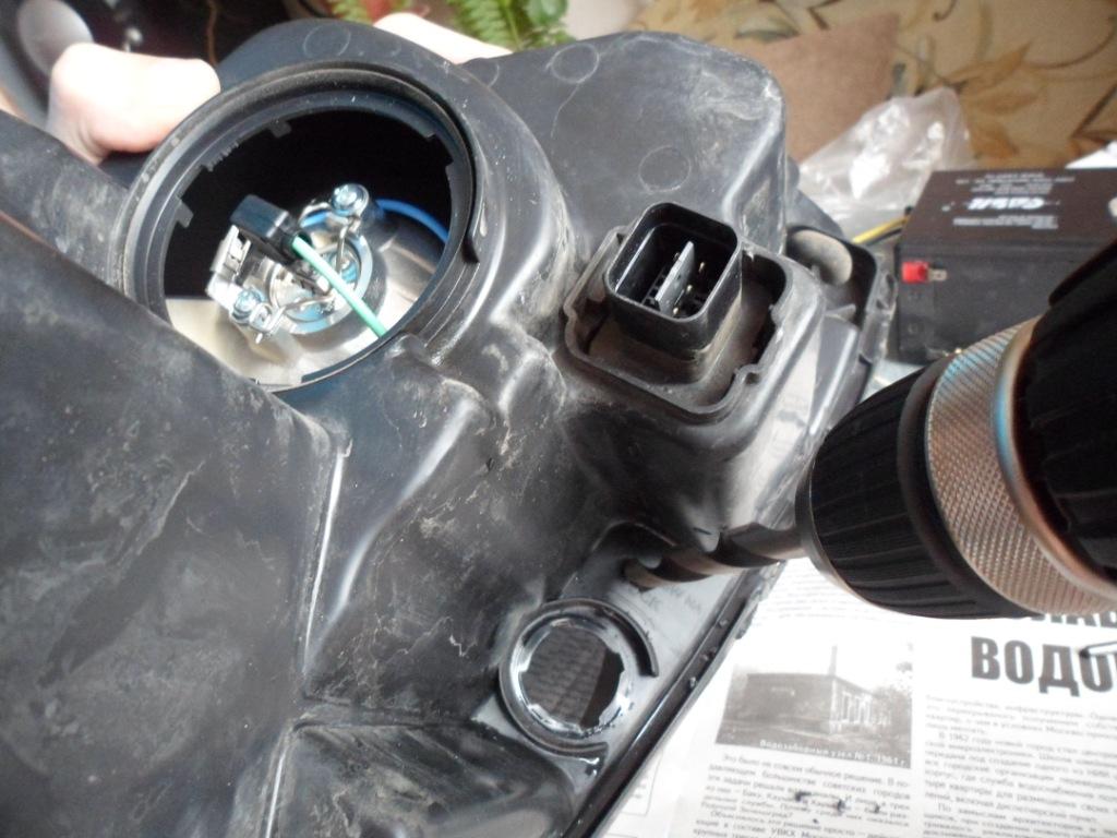 После этого сверлим только КОРПУС фары сверлом на 12 мм и вынимаем разъем из фары. Разъем надо вынуть для того чтобы через открывшееся прямоугольное отверстие вытряхнуть стружку пластика которая неизбежно попадет внутрь фары