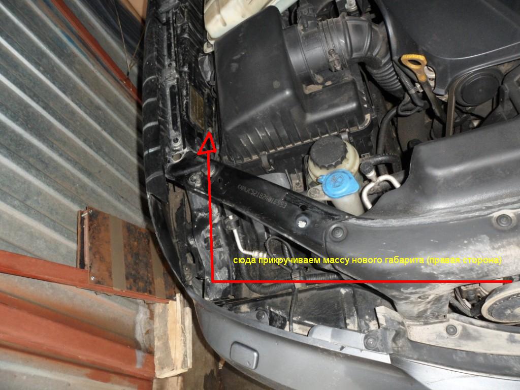 Разрезаем плюс штатного габарита и соединяем его с проводом нового габарита. Второй провод от нового габарита (с колечком ) прикручиваем к массе согласно фото.