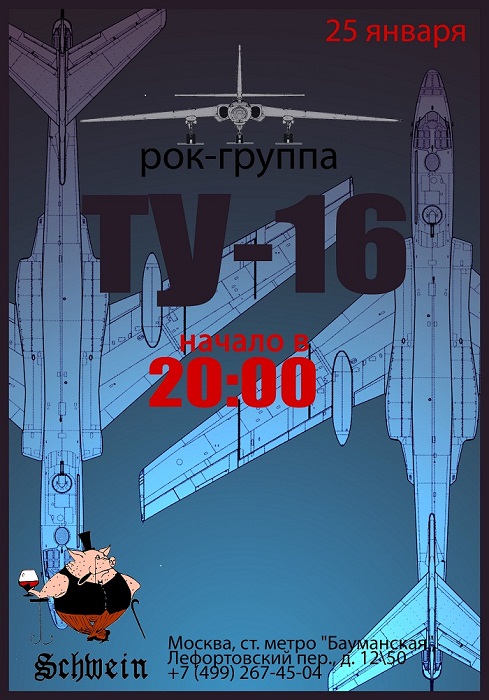 25 января в пятницу, в 20.00 в клубе "Швайн" состоится концерт группы "ТУ-16".