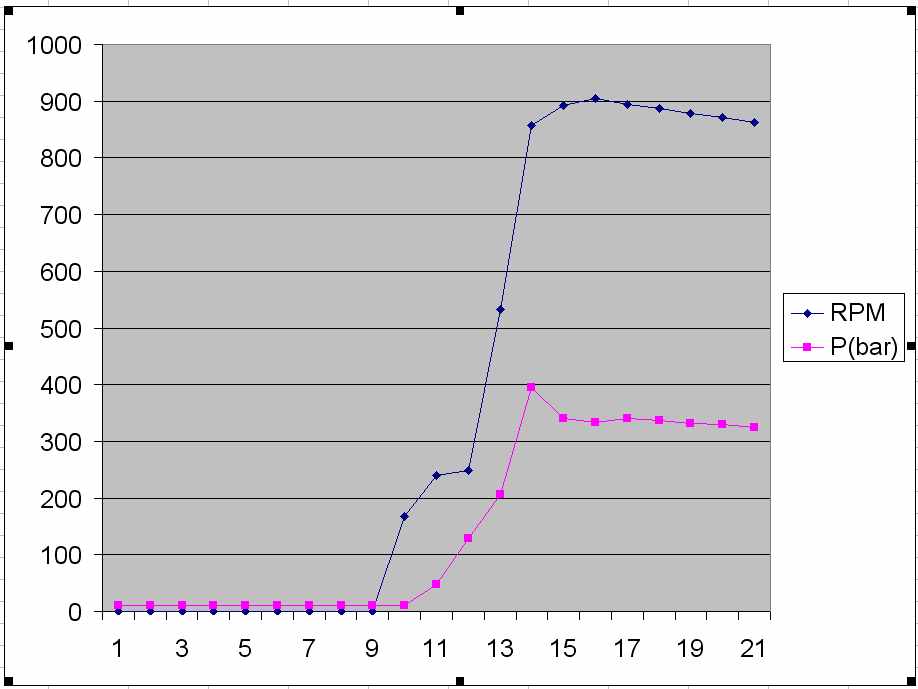 Теперь детально рассмотрим начальный момент. Уже через 0.6 сек давление поднимается до 300 бар, потом, видимо открывается клапан, и давление сбрасывается до 280 (ХХ).
