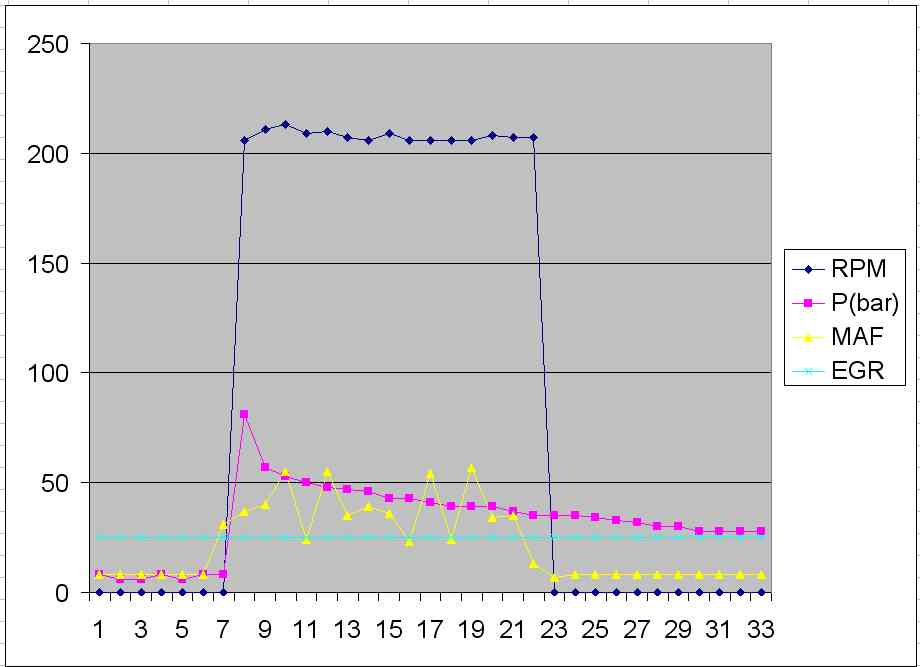 Вот как выглядит запуск, газ и глушение двигателя. EGR все время =25%. По оси времени разрешение 0.2 сек. MAF имеет заметное запаздывание.