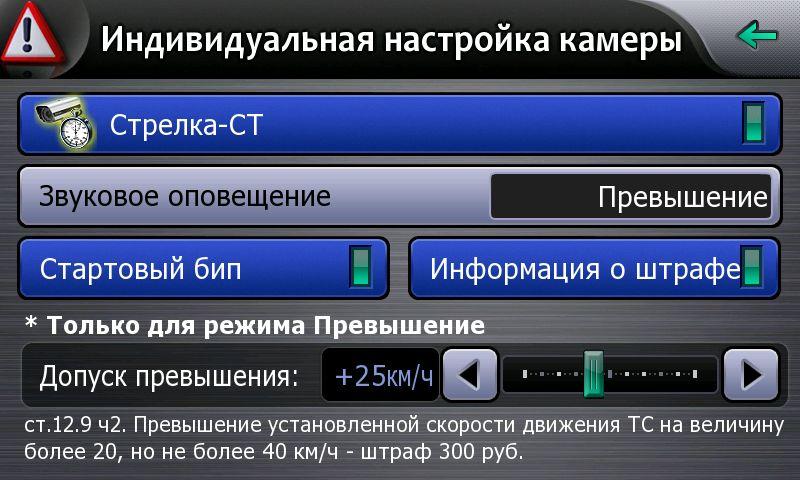 • для каждой камеры можно задать индивидуальные настройки: вкл-выкл, тип голосового оповещения, информацию о штрафе, для режима "превышение" можно указать допуск сверх разрешённого ограничения скорости и стартовый "бип"