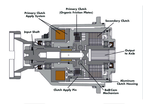 4. Первичное сцепление управляет размером открытого зазора камеры (от себя – создает давление на основное сцепление, исменяя конфигурацию корпуса подшипника с металлическим шариком).