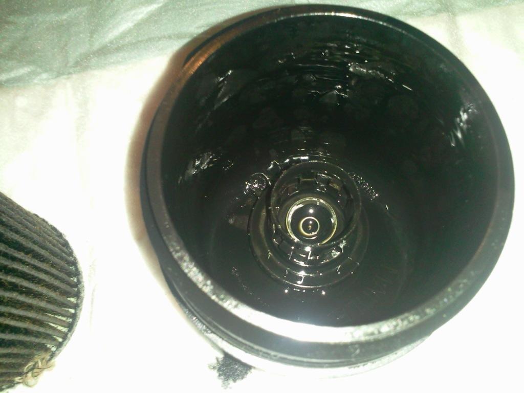 Резьбы много и крутить надо долго. Когда корпус отвернулся примерно на половину, через резьбу потекло масло, я подставил емкость, вытекло около 700 гр. Возможно шестигранником на 6 с торца корпуса фильтра отворачивается сливное отверстие, но у меня не пошло и я его трогать не стал. Когда масло перестало сливаться, до конца откручиваем и снимаем корпус с картриджем