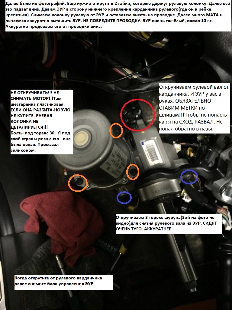 Вообще все узлы и сочленения я описал прямо на фото. Если вы о чёрной пластиковой шестеренке непонятной форме, то она между мотором ЭУР и самим ЭУР. Отсоединять мотор не рекомендую, т.к. эта шестеренка может быть в хлам разбитая и такую не купите... Попадёте на узел в сборе. Вообще разбор этого узла это огромный риск.
