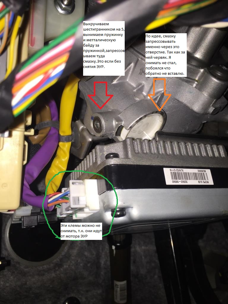 Снимаете пластиковую панель которая в ногах, будет доступ к эур. Слева увидите заглушка под шестигранник, ее откручиваете, вытаскиваете пружинку и пинцетом подцепляете металлич детальку оттуда..это самое сложное)) я брал шприц набирал смазку. На шприц плотно кусок шланга. шланг плотно приставлял к отверстию и запрессовывал смазку.. потом рулем крутил и опять запрессовывал. Смазку лучше безопасную для пластика. Не литиевую.