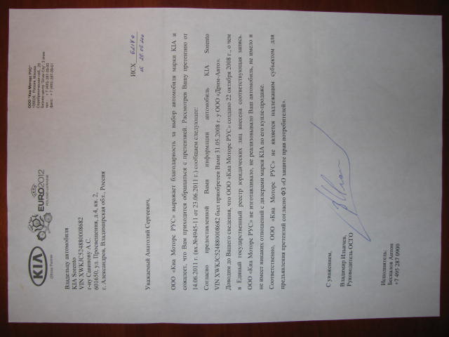 Доброго времени суток уважаемые сорентоводы! По поводу преемственности получил от КМР по моему однозначный ответ, "Ваш автомобиль выпущен в апреле 2008 г. а KIA MOTRS RUS зарегистрирована в октябре 2008 г. поэтому не к приобретённому вами автомобилю отношения не имеет" в общем гдето так.( просто нет под рукой их письма, позже выложу)