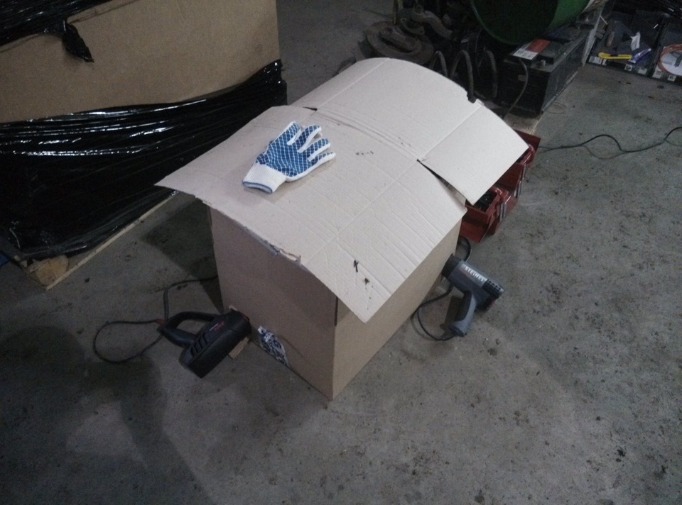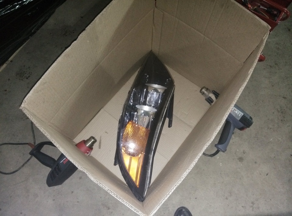 Нашли коробку в которую положили фару и засунули туда два фена, установили температуру на 200 градусов.