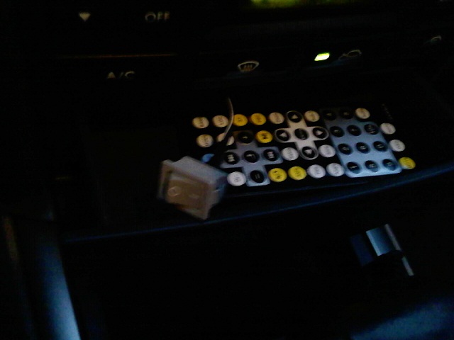 Далее я добавил отдельно кнопку убирания антенны, после длительных умозаключений разместил ее в ящичке под кондеем - антенна тупо вылазиет при включении магнитолы, неважно радио или другое, да и вообще давно хотел это сделать. Кнопку подобрал под цвет пластмассы, но чот передумал сверлить пока, запихал в ящик, для этого пришлось снимать блок управления климатом и сам ящичек