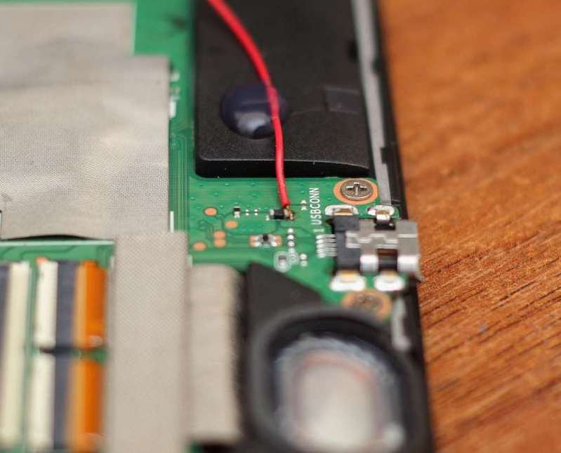 , т.е. до проклейки стеклотканью и шпаклевки/покраскипоскольку никаких OTG кабелей я не использую, то для включения планшета нужно подавать напряжение на разъем USB, на фото видна точка пайки. Сам разъем очень мелкий, припоял рядом.