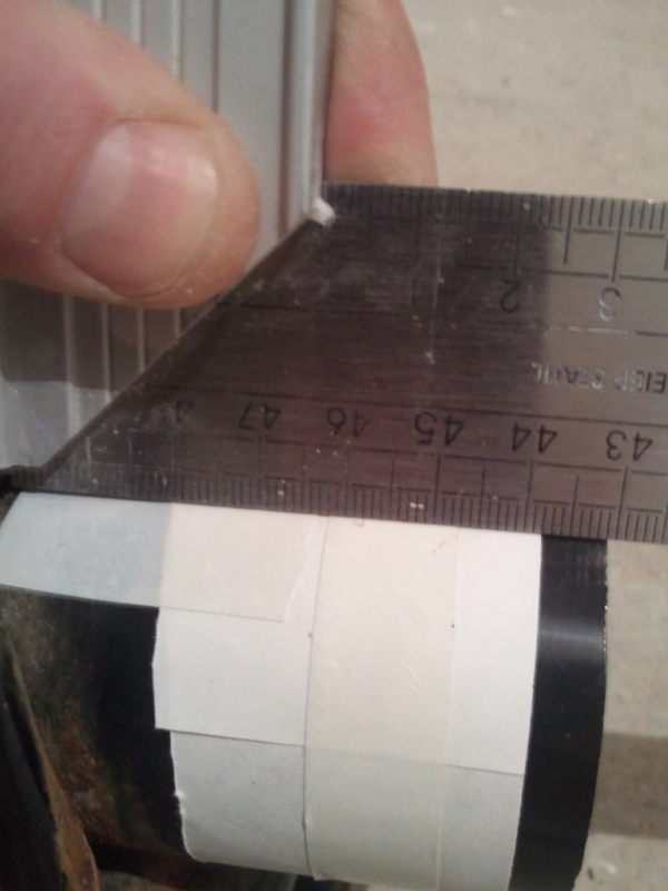 Для более ровного среза я использовал лист бумаги обернутый вокруг амортизатора и зафиксированный с помощью изоленты. Это позволило перемещать эту "линейку" по амортизатору. Отмеряем от края 63 мм и с помощью ручной ножовки по металу, постоянно поворачивая аммо отрезаем точно по "линейке". Срез получается достаточно ровный.