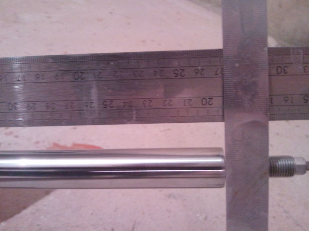 4. Вставляем картридж в штатный аммо и снимаем получившиеся размеры. Получаем 287 мм, а это меньше на 9 мм. Выходит, что если мы оставим все так как есть, то мы сокращаем и без того малый ход подвески. По моим подсчетам ход подвески уменьшиться почти на 20 мм. Не знаю почему, но на форуме бытует мнение, что изменение на арке равняется изменению на стойке. По моему мнению это не так - 5 мм на стойке равно 10 мм на арке, возможно ошибаюсь.