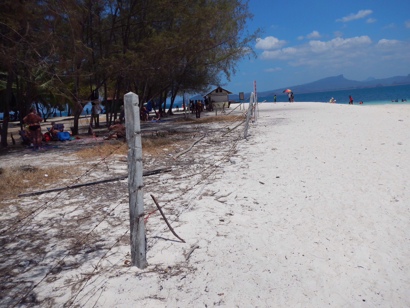 Приплыли. О-па! Реально приплыли! На острове было раз в 5 больше людей чем раньше, и соответственно лодок ибо остров не жилой. Только мы ступили на берег, к нам подбежал ушлый мужичонка и потребовал денег (200 бат с человека) на мой вопрос с какой это такой радости, он махнул в сторону плаката и объявил что Пода это теперь национальный парк и вход платный. Супер! Ну ладно, тайцы люди небогатые, а мы не обеднеем, заплатил. Пошли в доль пляжа и что же я увидел!? Да я чуть в обмоток не упал! Они от городили растительность пляжа от острова колючей проволокой в три ряда!!! Твою мать, это что за гетто? А я уже договорился чтобы лодка забрала меня в 15.00... Первый день загорать весь день на открытом солнце вообще не айс, через 30-40 минут волдырями пойдешь.. Нашел прогал в проволоке, расположились в тени, но на море смотрели из-за колючки