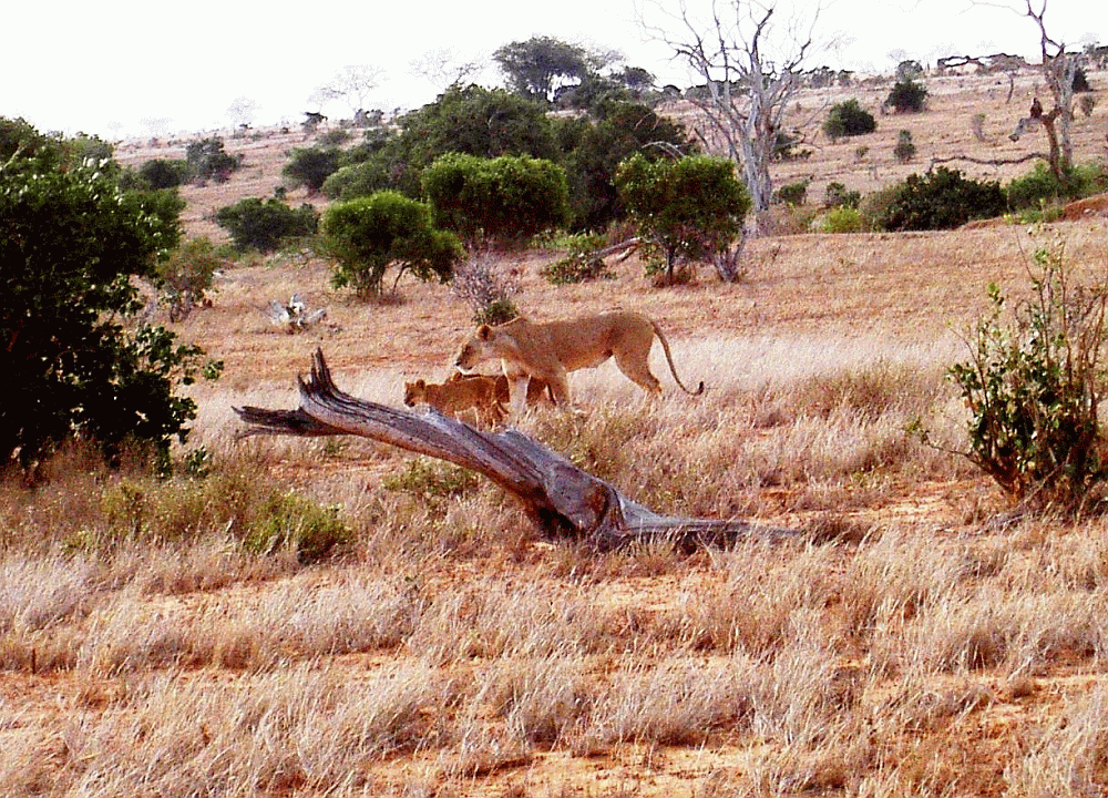 Если приглядеться,то справа видно "владельца гарема".Одна из львиц всегда наблюдает за происходящим недремлющим оком.Тут поднялась вторая,они о чём-то "поговорили",и вторая львица пошла к нам навстречу.Она прошла в метре от машины,перейдя дорогу,немного удалилась,скрывшись в высокой траве,и стала возвращаться.Когда красавица подошла к нашему джипу,мы обнаружили очаровательных малышей,следующих за своей няней.А нянями львицы работают по очереди,занимаясь со всеми львятами прайда!