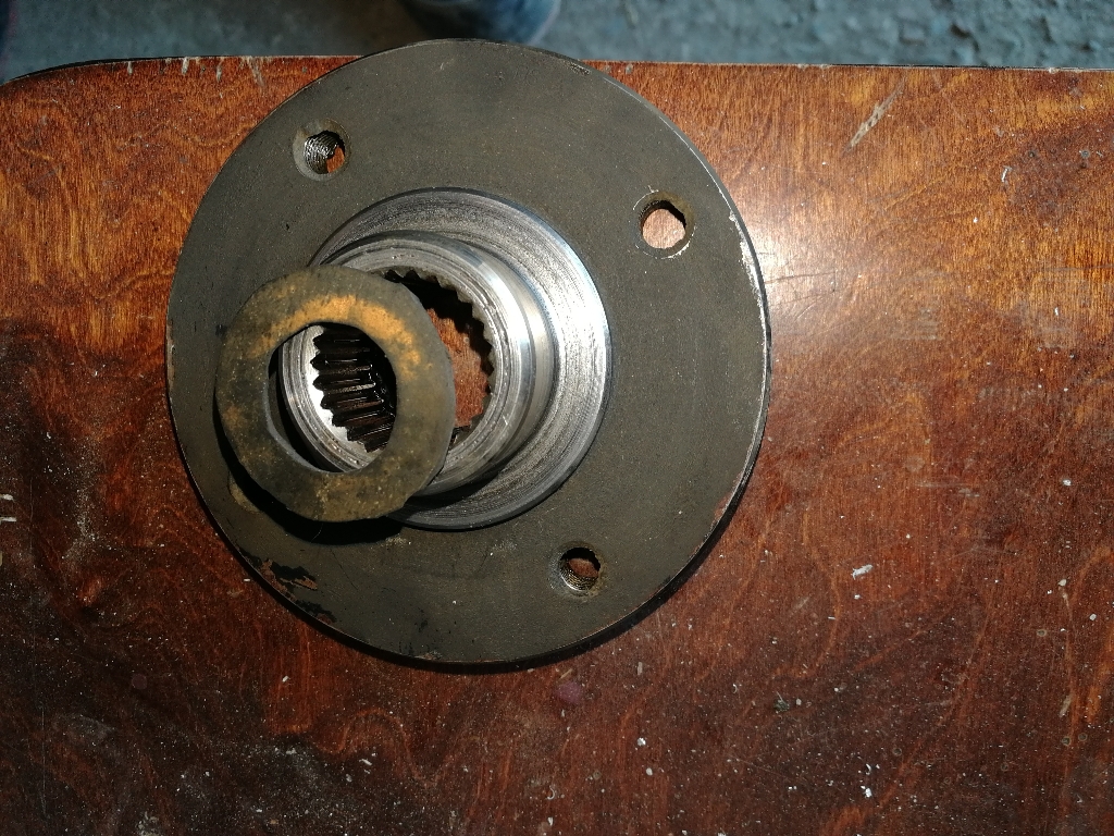Я снял флянец карданного вала и установил резиновое колечко, на вал, которое компенсирует не достаточное прижатие флянца заднего кардана. При долговременном проскальзывании шестеренка видно немного стачивается и не хватает прижимая от флянца заднего кардана.