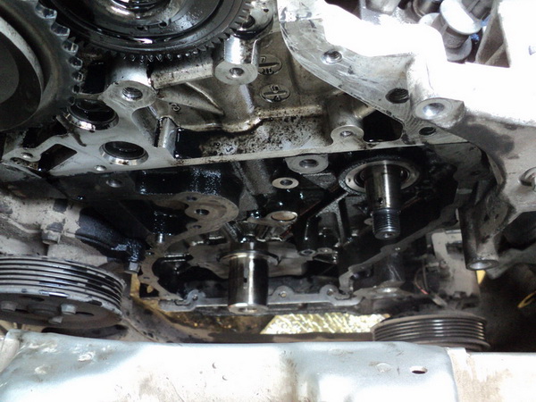 Далее вернул на место держатель (раму –сам так назвал) РВ, установил РВ и крышки подшипников РВ. А вот здесь внимание! При установке РВ смотри метки на шестернях РВ – одна спереди , а другая сзади (см. фото). Одна из шестернёй разделена на две части и она подпружинена и тем самым при установке РВ нужно их совместить с обеих сторон. Далее 20 болтов вернул на место (момент затяжки – 10.8-12.7 Н.м). После установил гидронатяжители (затяжка – 9.8-11.8 нм), успокоители, шестерню КВ, нижнюю цепь вместе с шестернёй ТНВД (момент затяжки гайки – 78.5-93.2 нм), далее верхнюю цепь и успокоитель верхний при этом всё строго по меткам. Снял чеки с гидронатяжителей. Прокрутил КВ несколько раз на 360гр. и убедился в совпадении всех меток. Далее установил крышку ГРМ (места нанесения герметика видны по старому герметику) тюбика хватит на всё (затяжка – см. фото). Далее установил шкив КВ (затяжка болта – 196.1нм + довернуть на 60 гр.), клапанную крышку (затяжка первый подход – 3.9-5.9нм и второй подход 8.8-10.8 нм. порядок затяжки – см. фото). При установке клапанной крышки в местах соприкосновениях с крышкой ГРМ и блоком, местах соприкосновения клапанной крышки с вакуумным насосом, внизу также в местах соприкосновения крышки ГРМ и с верхним масляным поддоном – нанести герметик, но аккуратно. Впускной коллектор (затяжка – 19.6-23.5нм). При установке форсунок обязательно обратить внимание на грязь в колодцах, должно быть очень чисто (затяжка форсунок – 32.6-41.3н.м), если попадёт грязь между медным кольцом форсунки и блоком – то как следствие может не запуститься движок.