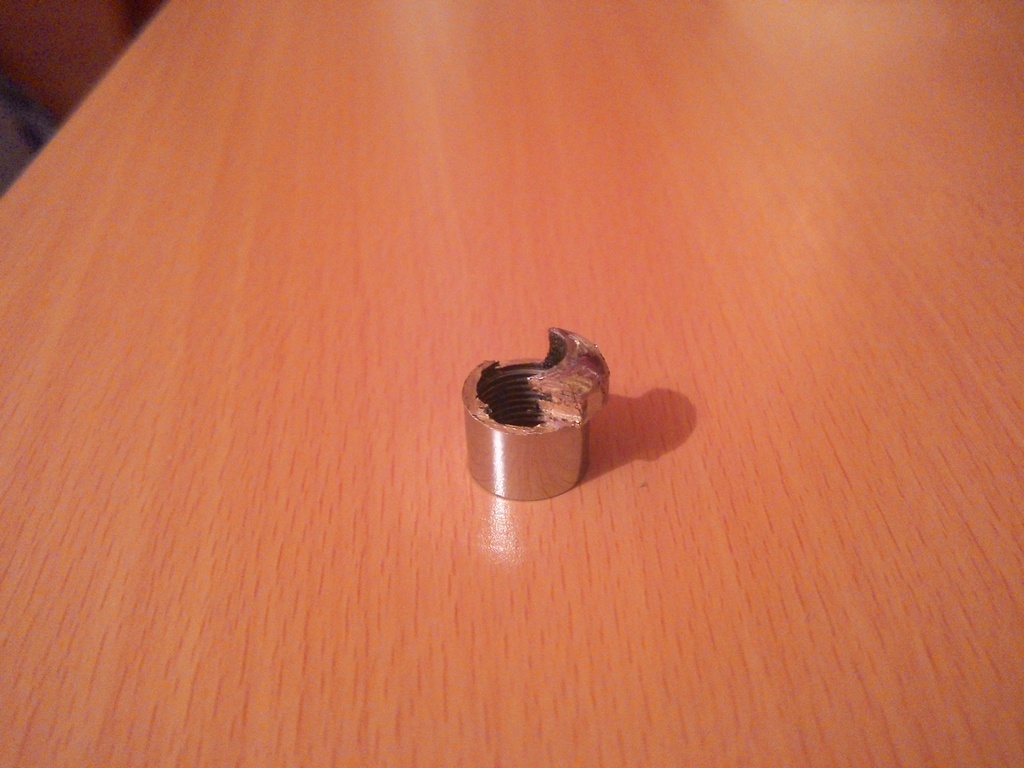 4) Отворачиваем верхнюю хромированную гайку ключем на 17, у меня не отвернулась вертелась вместе с антенной и латунной трубкой( что с ней стало смотрите на фото ниже). Взял ножовку, сделал пропил сверху до черной пласмаски, потом ножовку в щель между пласмасской и гайкой, отпилил сегмент потом повернул пропилил второй так же и третий, четвертый не пришлось гайка стала свинчиваться( пилится легко латунь все таки, по времени мин 5 не больше на вес)