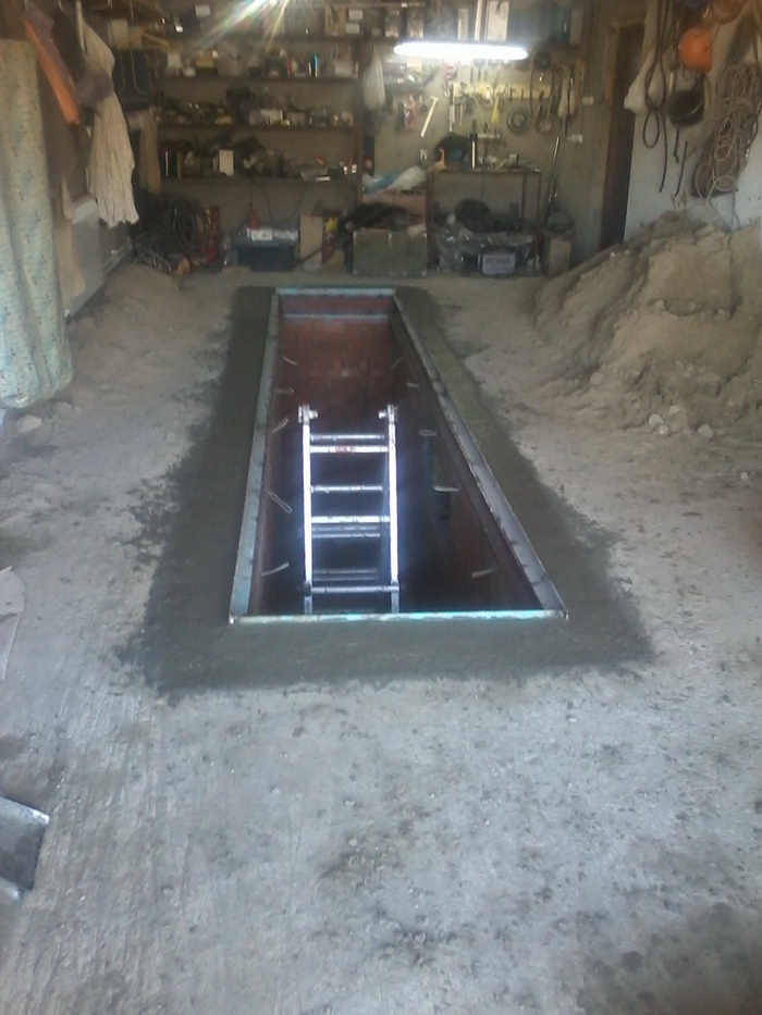 Одна была проблема - ямы в гараже нет ... Итак решил начать с ямы... Заказал из города спеца с бетонорезом и выпилили в полу 1,2х7м проём. У родственника на даче сторожем узбек молодой, с удовольствием ухватился за калым. Днём копаем, а вечерами я штудирую форум... Привезли кирпич, цемент, залили пол в яме, обложили кирпичом, сделали нишу, проложил свет, сварил сверху обрамление из 14 двутавра, утеплили наружную стену, залили вокруг ямы пол.... И с началом ледохода на Обском водохранилище 10 апреля загнал машину в гараж на яму!!!