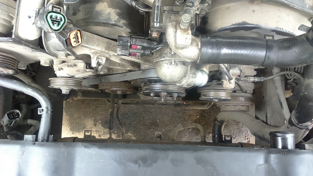 10. Далее откручиваем две верхних пластиковых защиты ремня ГРМ. Отгибая нижнюю пластиковую защиту мы видим нужный нам датчик положения коленвала и прекрасно понимаем, что он вполне меняется без снятия ремня ГРМ. НО, (...идет мат и нецензура :evil: ) ребятки из поднебесной решили усложнить нам задачу и чтоб снять нижний пластик необходимо снимать шкив коленвала. Ну скажите зачем??? (я плевался, материл этих инженеров, в общем конструктивно, на мой взгляд, сделано не правильно. Тот кто будет разбирать поймет, и сразу поймет как надо было сделать эту нижнюю крышку))). Далее подергав шкив коленвала я понял, что самостоятельно его не сниму (да и не очень-то хотелось), решил просто отогнуть пластик на сколько это возможно и все поменять (пластик гнется хорошо, но без фанатизма). Подлезть не очень удобно, но можно. Все зависит от толщины пальцев (ничего личного, без всяких обид))). Делал я все сам, первый раз, поэтому в один день я все только разбирал (прим. 7-8 ч.), далее на другой день все собрал (там уже все просто). Антифриз заменил.