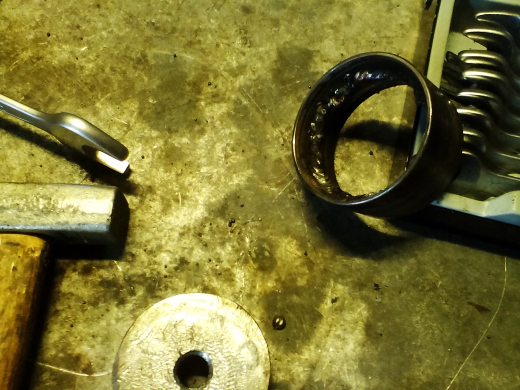 12. Сборка в обратном порядке. Внутреннюю поверхность поворотного кулака тщательно очистить внутри. Смазав моторным маслом ступицу снаружи и кулак внутри, запрессовываем новый подшипник. Следует обратить внимание на то, что при запрессовке подшипника давить надо в его НАРУЖНУЮ ОБОЙМУ. А при запрессовке ступицы в подшипник надо подложить с обратной стороны подшипника головку соответствующего диаметра под ВНУТРЕННЮЮ ОБОЙМУ подшипника. После выпрессовки старый подшипник не имеет смысла выкидывать, он пригодится в качестве оправки для обратной запрессовки нового подшипника. Шлицы шруса и ступицы тщательно очистить от грязи и окалины. Нанести на шлицы шруса и ступицы медную высокотемпературную смазку (не графитовую). Если вдруг придется снова менять подшипник, вал шруса выдавится усилием пальца руки. Не забыть поставить на место стопорное кольцо!