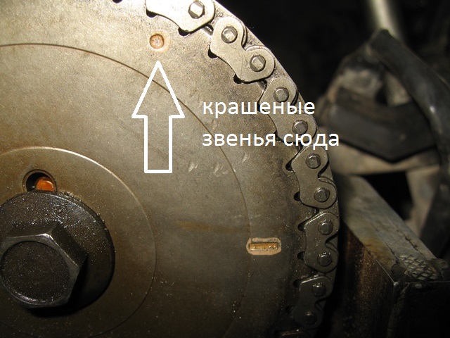 Ты же когда цепи цепи ставишь крышки и шкива еще нет. На нижних шестернях КВ тоже есть точки на нужном зубе. На него ставь крашеное звено.