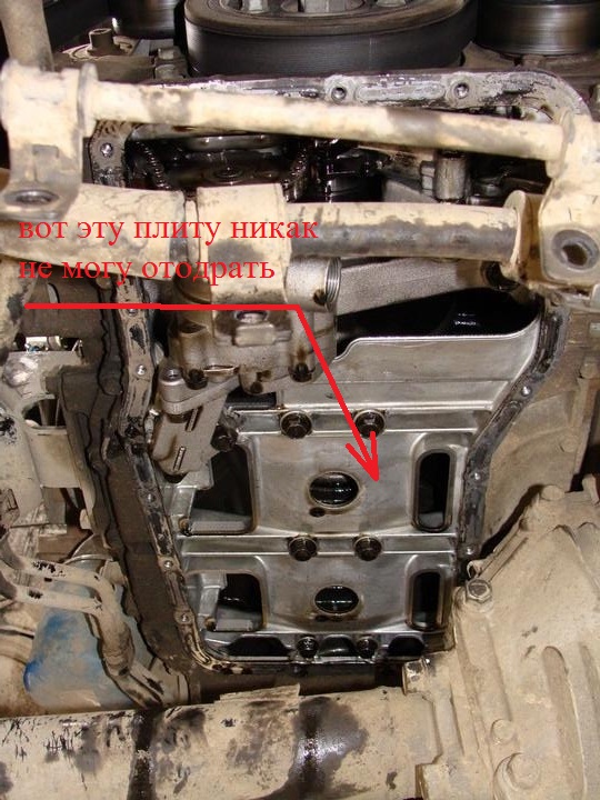 Нужно снять все крышки и цепи, потом снять крышку которая стоит за цепью коленвал-ТНВД, потом снять защиту махавика (паралоновая), открутить от блока насос кондиционера, открутить все болты силовой плиты картера и только тогда без последствий можно снять!!!!