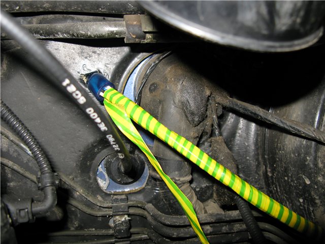 От ЭБУ КК идет жгут из 10 проводов. Чтобы его завести в салон, в моторном отсеке просверлил отверстие 14 мм левее и выше центра основного жгута над тросиком газа. Перегородка двойная, расстояние между ребрами около 30 мм. Сверлил последовательным увеличением диаметра сверла 3, 7,10,14 мм. В образовавшееся отверстие плотно вставил 8-ми сантиметровый отрезок пластикового шланга с внутренним диаметром 10 мм. Внутрь шланга пропехнул жгут.