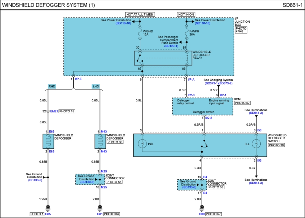 Видно, что индикатор получает питание через предохранитель W/SHD 15A (№1 в блоке предохранителей) и контакты реле WINDSHIELD DEFOGGER RELAY. Через эти же контакты получает питание сам нагреватель. Очевидно, что контакты замкнуты по какой-то причине.