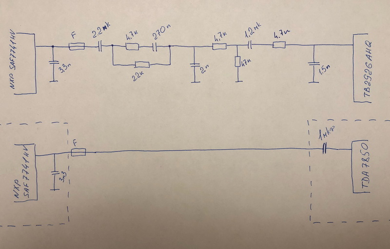 И еще на этих магнитолах в цепи от звукового процессора до усилителя стоит фильтр, который режет звук. На сколько я понимаю это сделано чтобы подкорректировать звук под штатные динамики (чтобы они не булькали, не зарывались и т.д.). Я на X8BB попробовал от этого фильтра избавиться. Пошел кардинально. По даташиту процессора на выходе должен стоять только конденсатор 3,3n на землю и все, дальше уже линейный выход. По даташиту на усилитель на входе стоит только разделительный конденсатор. Получается что все остальное это шаманство разработчиков магнитолы. Я удалил все лишние детали фильтра (оставив только конденсатор 3,3n на землю и нулевое сопротивление F) и замутил прямое прохождение звука, поставив только сверху пленочные разделительные конденсаторы 1мкф. Получилось как на нижней схеме. В результате эксперимента звук немного изменился. Я не меломан, но низы стали мягче. Все это слушалось на штатной акустике. На нештатной акустике, думаю будет заметнее.