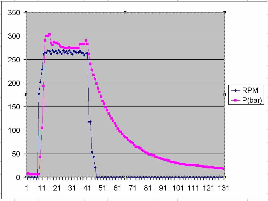 Теперь детально рассмотрим начальный момент. Уже через 0.6 сек давление поднимается до 300 бар, потом, видимо открывается клапан, и давление сбрасывается до 280 (ХХ).