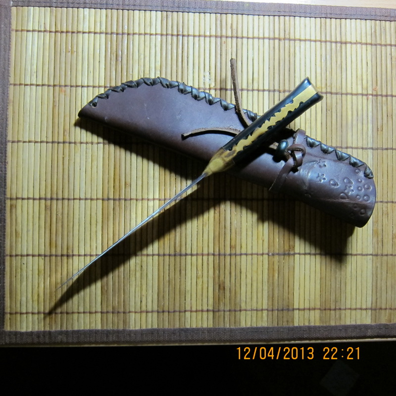 Пчак от Дмитрия Зекселя (ака Дед Димон). Единственный экземпляр, сделанный по моему заказу. Кованая нержевеющая термоциклированная 95Х18 с промежуточным подогревом в среде инертных газов с трехкратным отпуском и последующей криообработкой. Твердость 58-60 HRC. Железка после полировки дала интересный рисунок булата. Накладки рукояти-рог буйвола. Гюльбанд-латунь. За 4 года эксплуатации правил только 1 раз. И то не потому, что надо было, а потому, что..."ну сколько можно ждать, когда он затупится" :D