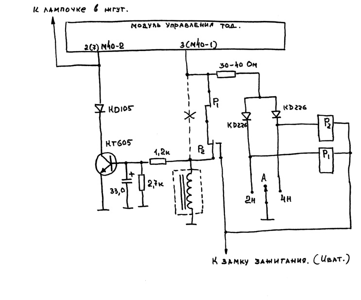 Начну с того,что у меня в двух книжках на схеме вывод семь разъема М40-2(правый) идет на негорящий в обычных условиях значек трансмиссии.Реально на разъеме этот провод на втором контакте.Этот значек начинает мигать при нарушениях работы ТОДа.Затрудняюсь сказать при каких ,их видимо несколько.Схема индикации,несмотря на элементарные начертания работает весьма непросто.На входе меандр с переменной скважностью.С постоянной времени в базовой цепочке пришлось повозится.При скважности 2(остановка,равномерное движение по сухой дороге и т.п)транзистор практически заперт(емкость успевает разряжаться и напряжение на базе близко к нулю) и значек трансмиссии не горит.При увеличении скважности(загрузка переднего привода),емкость не успевает разряжаться и транзистор открывается,зажигая индикацию.(На частоту мерцания лампочки емкость не влияет,частота 50Гц,глазом практически не улавливается).Штатный режим работы индикации неисправности трансмисии сохранен.С модуля на 2(7) контакт просто подается с какого-то мульта земля и значек начинает мигать.