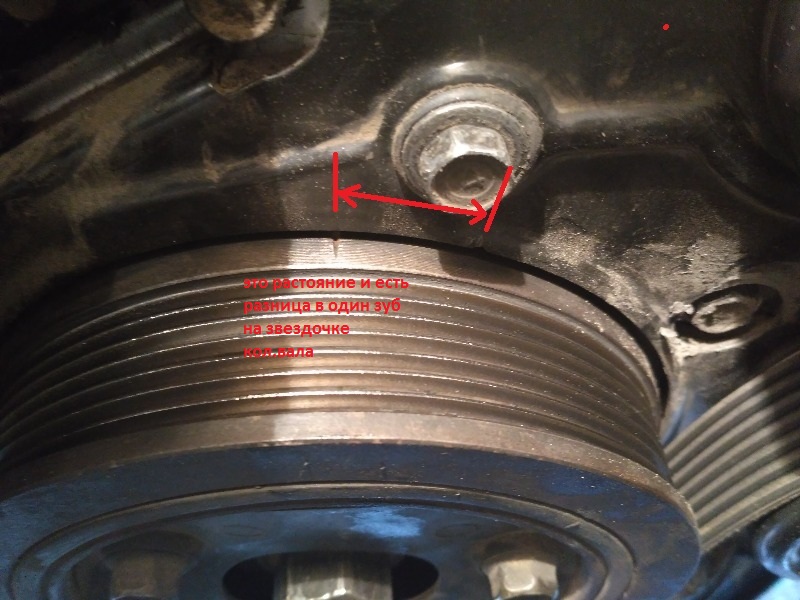 Уход метки на шкиве влево при установке распредвалов на место, это и есть разница в один зуб на средней цепи.