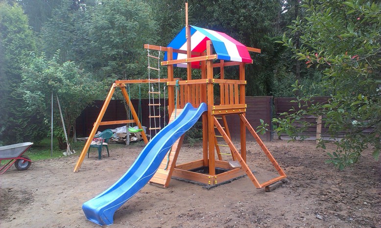 дальше - лак, замена крыши на деревянную, сборка оставшихся частей (ванты, качели, кольца, флажок на крышу), монтаж "взрослой" части слева от комплекса (большие качели, м.б. лавочки), ландшафт - травка, кустики, мостики