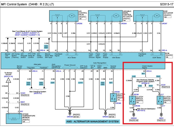 Я не знаю подробностей работы схемы, но вспоминаю по аналогии с другими машинами. Раньше ездил на ASX, там для установки круиза на акпп нужны были только кнопки, а на мкпп еще и датчик педали сцепления. Здесь по схеме датчик педали тоже есть. Этот датчик замыкает 44 ногу разъема CRD-K на землю.