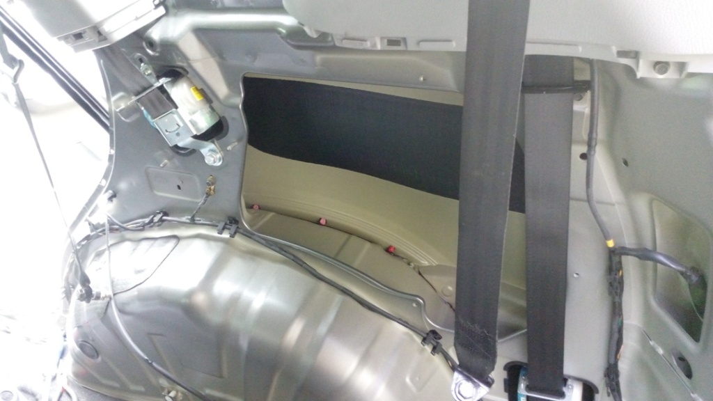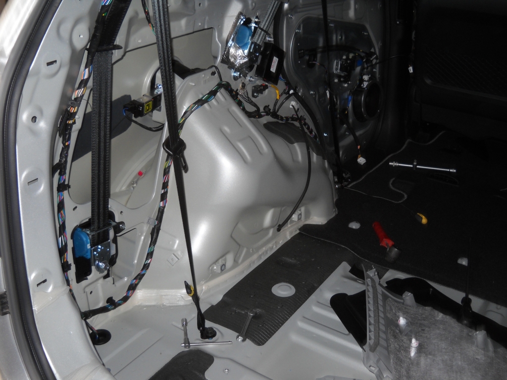 Для установки розетки необходимо снять правую боковину обшивки багажника. Для этого демонтируем правое сидение третьего ряда, откручиваем два ремня безопасности и заднюю панель багажника. Снимаем правую чёрную панель. Белые панели можно не трогать. Проводим вдоль существующего правого пучка проводов провод питания. Я провёл мягкий провод 1.5 квадрата красного цвета. Минус подключаем к существующей клеме находящейся рядом. Через предохранитель подключаем к проводу, который отключает питание после выключения зажигания.