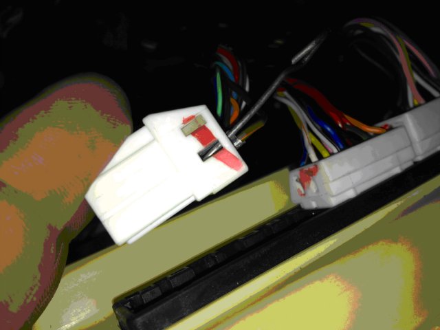 7.1.2. Из короткой колодки, булавкой или с помощью стальной проволоки диаметром 1,2 - 1,3 мм, извлекаем белый провод с оранжевой полосой. Из средней колодки извлекаем зеленый провод с черной полосой. Соединяем их между собой.