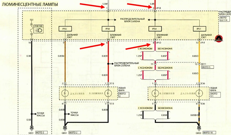 Схема для правой и левой фары одинаковые, отличаются точками подключения - приведена схема для одной фары.