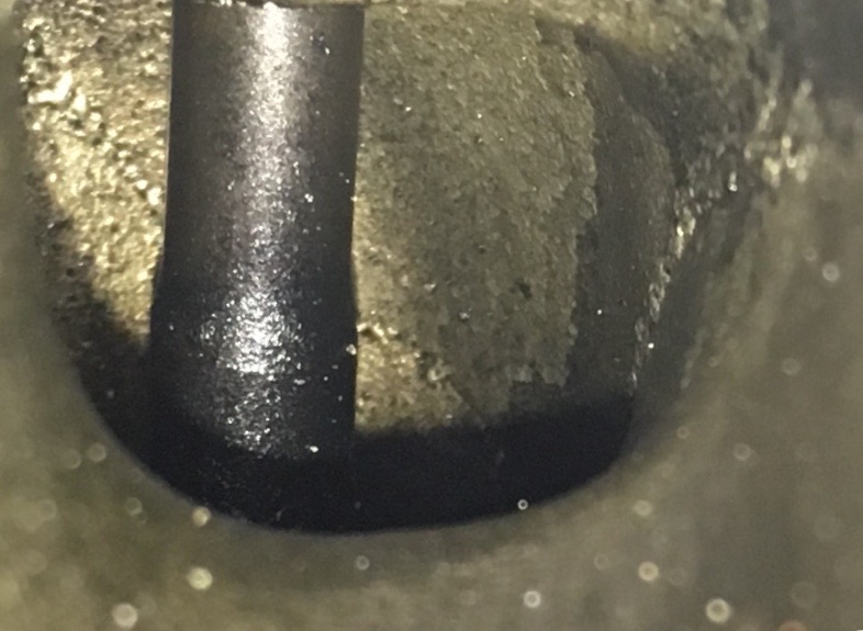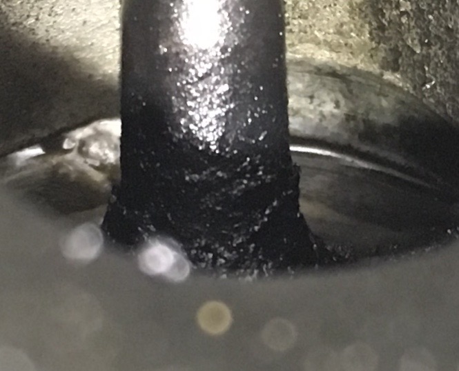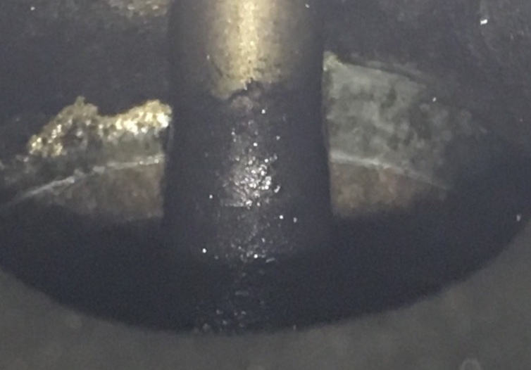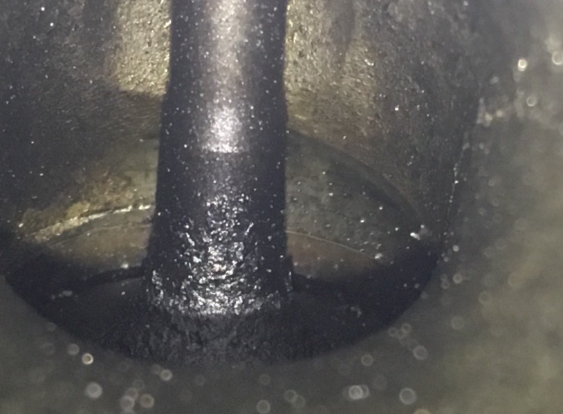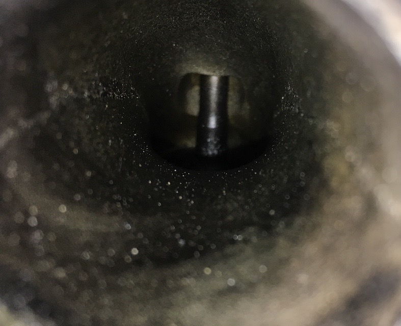 Пока снят впускной коллектор, залез телефоном во впускные отверстия головки и умудрился с увеличением заснять состояние коридоров и впускных клапанов. Надо сказать что стенки впускных коридоров достаточно чистые, без «шубы» из гуталина как на дросселе и в пластмассовом впускном коллекторе. Видимый на фото черный налет на стенках в начале коридоров легко протирается смоченным в бензине куском тряпки на пальце. А глубже, в основании впускных клапанов на верхней стороне тарелок, уже имеются засохшие саже-масляные наросты.