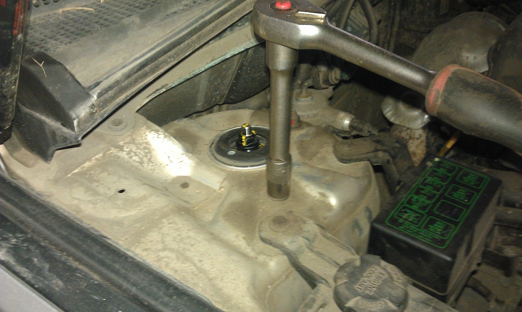 Далее, откручиваем крепление стойки - 3 гайки под капотом, и обязательно сначала ослабляем гайку на штоке амортизатора.