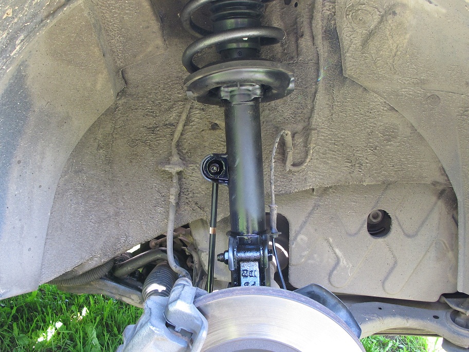 Зафикрировал картридж винтом с торца, прокачал на всякий случай и далее приступил к сборке стойки. Нижний изолятор пружины, к сожалению, протерся, а новый я не покупал. Пришлось на нижний виток пружины одеть кусок толстого армированного шланга. Далее по мелочи - поменял опорные подшипники, поставл отбойники SS20 и десяточные пыльники. Кстати, после сборки стойки не спешите разжимать пружину! Картридж имеет больший ход штока, поэтому отверстия на ступице и на стойке будут не совпадать по высоте. Сначала полностью ставим и крепим стойку, потом снимаем стяжки пружин. Жесткость для начала оставил в "нулевом" (самом мягком) положении.