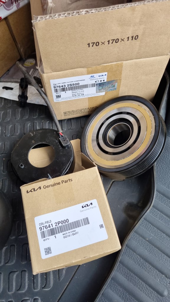 Решил сам повозиться. Прижимную пластину открутить без проблем (зафиксировав ее упертым в элемент подвески шестигранником) Снять стопорное кольцо шкива - тоже без проблем.. Далее со стороны днища через дерявянный длинный брусок несильными ударами молотка шкив легко сходит (потом вообще руками). Дальше проблемы - снять стопорное кольцо с самой катушки - места мало (силовой каркас кузова). В итоге долгой возни варварским методом погнув стоп. кольцо удалось его провернуть и выбить,(один упирает отверткой, помощник из подкапотного пространства бьет молотком по деревянному дрыну, чтобы хоть как-то через отвертку сдвинуть стоп. кольцо.) Следующий геммомрой - это стопорный винт массы 976800-2S000. Никакой отверткой не подлезть, даже битой с маленькой трещеткой - в итоге долгие мучения с пассатижами принесли успех. Вместо винта (под крестовую отвертку) лучше поставить короткий болт М6 с гровершайбой.