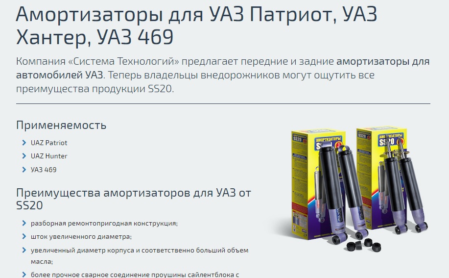Inoche писал(а):P.S. SS20 себе ни кто не ставил? Они для УАЗов делать стали амортизаторы, есть и с ухом и штоком.