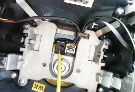 Собрали? Я тоже. Теперь разбираем. Связаные блоки невозможно вставить в руль. Сначала вставляем оба блока, предварительно просунув внутрь провода, а потом соединяем провода в один разъем.
