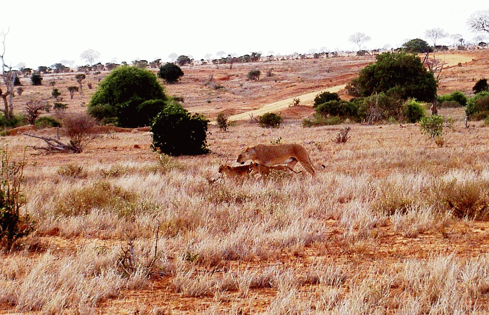 Если приглядеться,то справа видно "владельца гарема".Одна из львиц всегда наблюдает за происходящим недремлющим оком.Тут поднялась вторая,они о чём-то "поговорили",и вторая львица пошла к нам навстречу.Она прошла в метре от машины,перейдя дорогу,немного удалилась,скрывшись в высокой траве,и стала возвращаться.Когда красавица подошла к нашему джипу,мы обнаружили очаровательных малышей,следующих за своей няней.А нянями львицы работают по очереди,занимаясь со всеми львятами прайда!